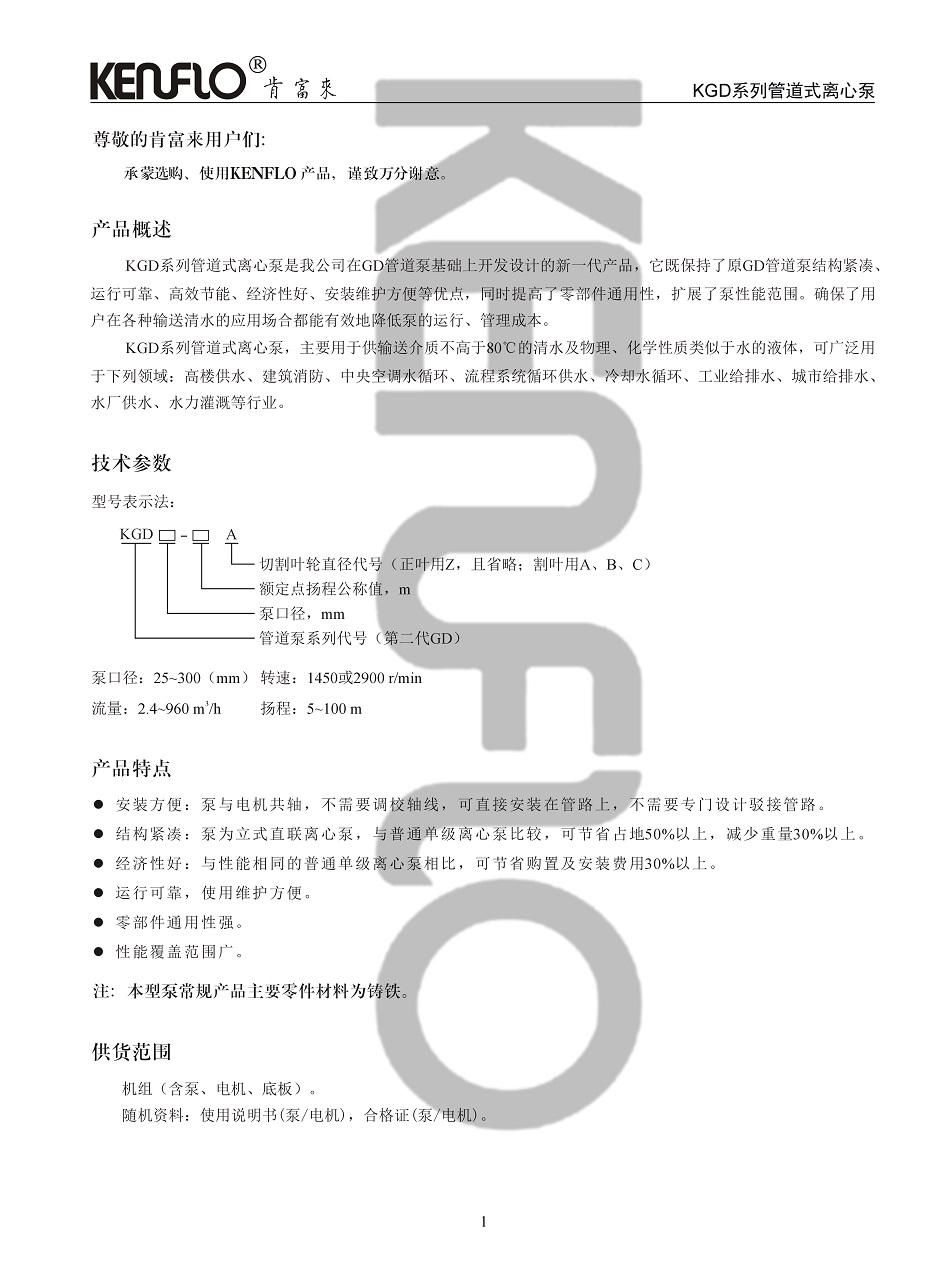 KGD系列管道式离心泵是肯富来在GD管道泵基础上开发设计的新一代产品,它既保持了原GD管道泵结构紧凑、运行可靠、高效节能、经济性好、安装维护方便等优点,同时提高了零部件通用性,扩展了泵性能范围。确保了用户在各种输送清水的应用场合能有效地降低泵的运行、管理成本。